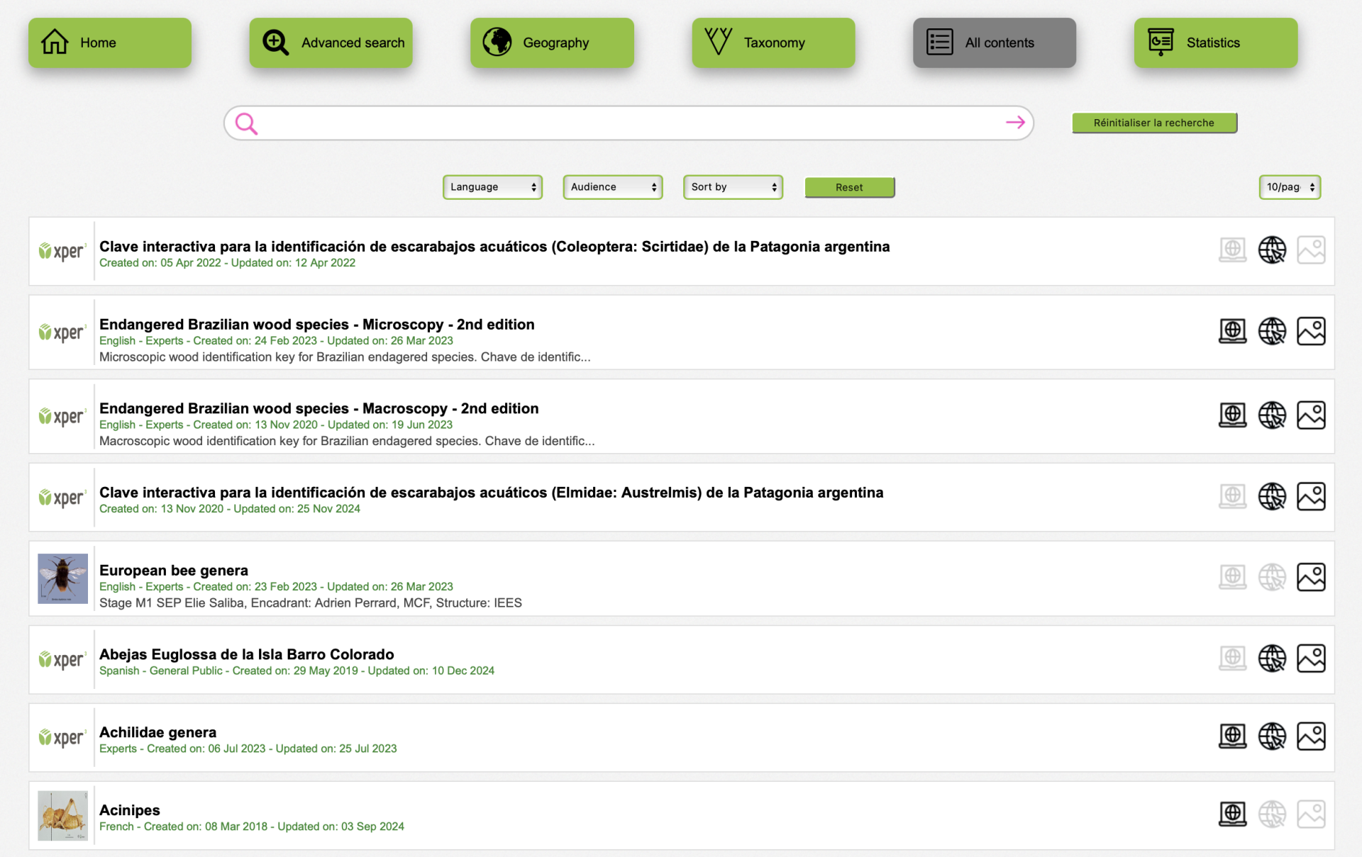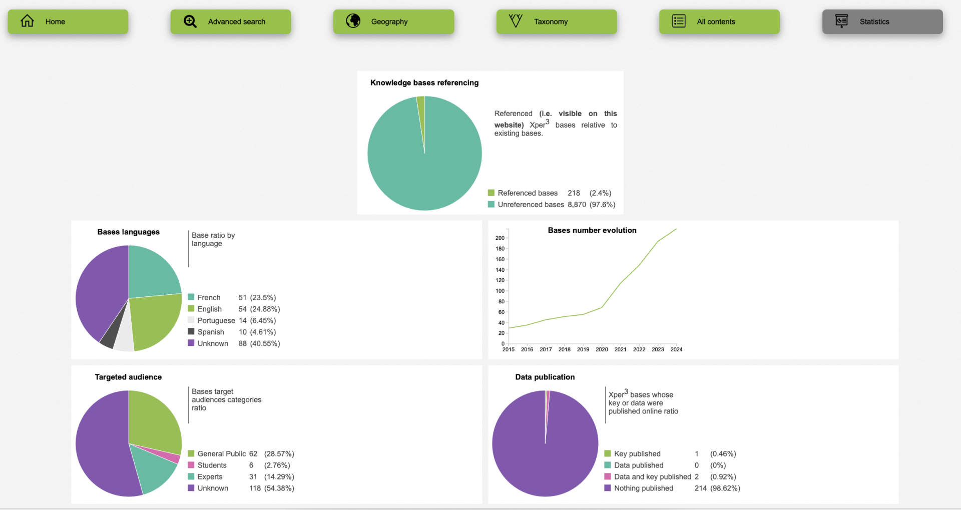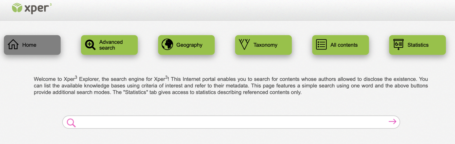 Xper3 Xplorer is the Xper3 search tool! This portal allows you to search for content whose authors have agreed to communicate their existence. The knowledge bases can be listed according to the criteria that interest you and consult their metadata. The Xplorer makes it possible to search based on a single term or with advanced views, using the buttons above the search bar. The “Statistics” tab provides descriptive statistics on referenced content only.