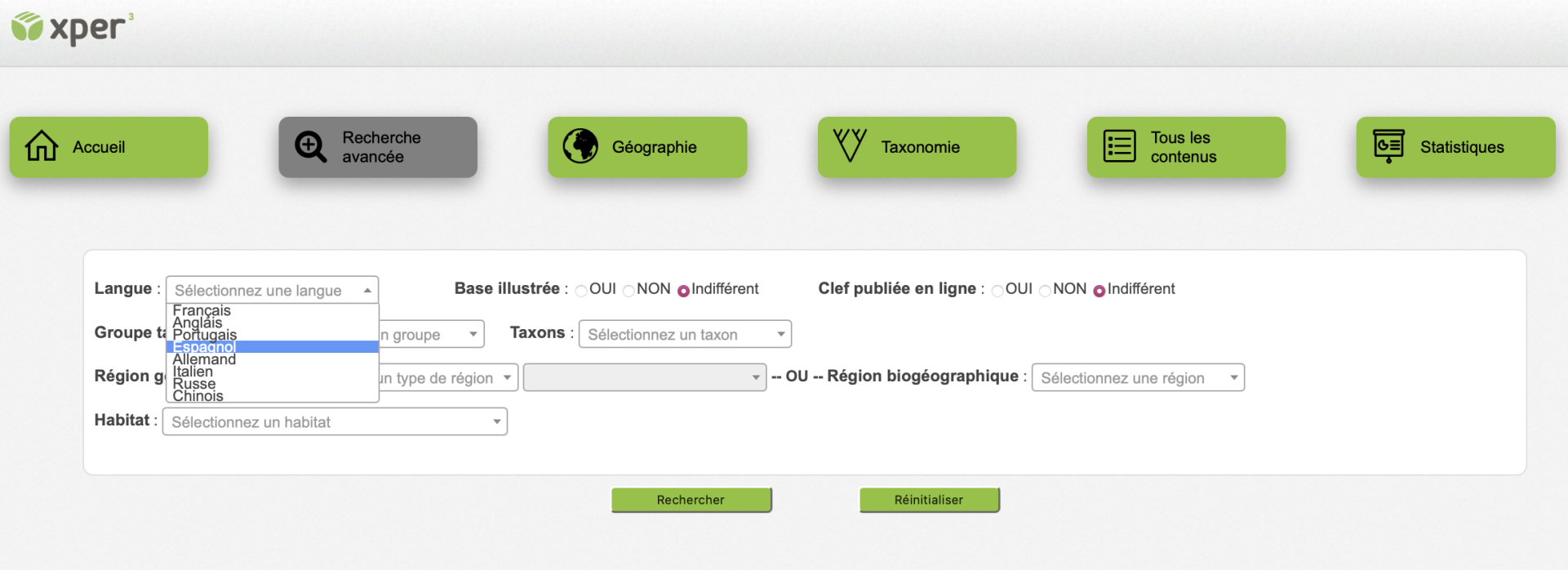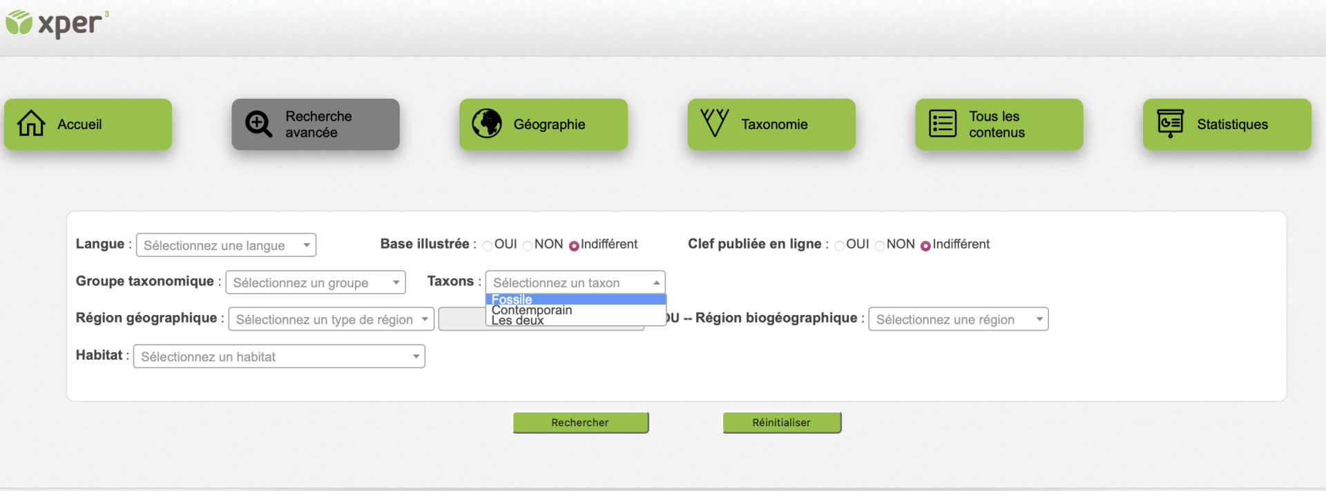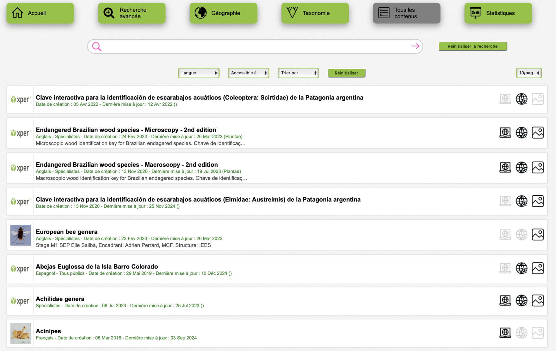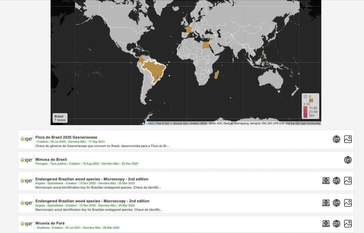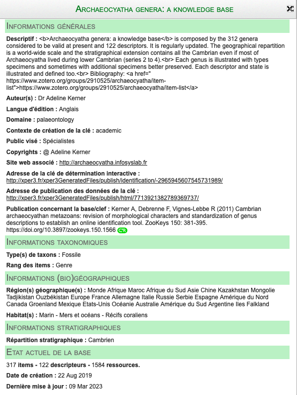 Ce site contient des informations sur les bases de connaissances Xper2 disponibles à ce jour. Vous pouvez y chercher celles qui vous intéressent, suivant le groupe d’organismes qu’elles décrivent, leur zone géographique, leurs milieu de vie, etc. Vous trouverez également toutes les informations qui concernent le logiciel Xper2, et des définitions de concepts en systématique et en biologie comparative (descripteurs, taxons…).
