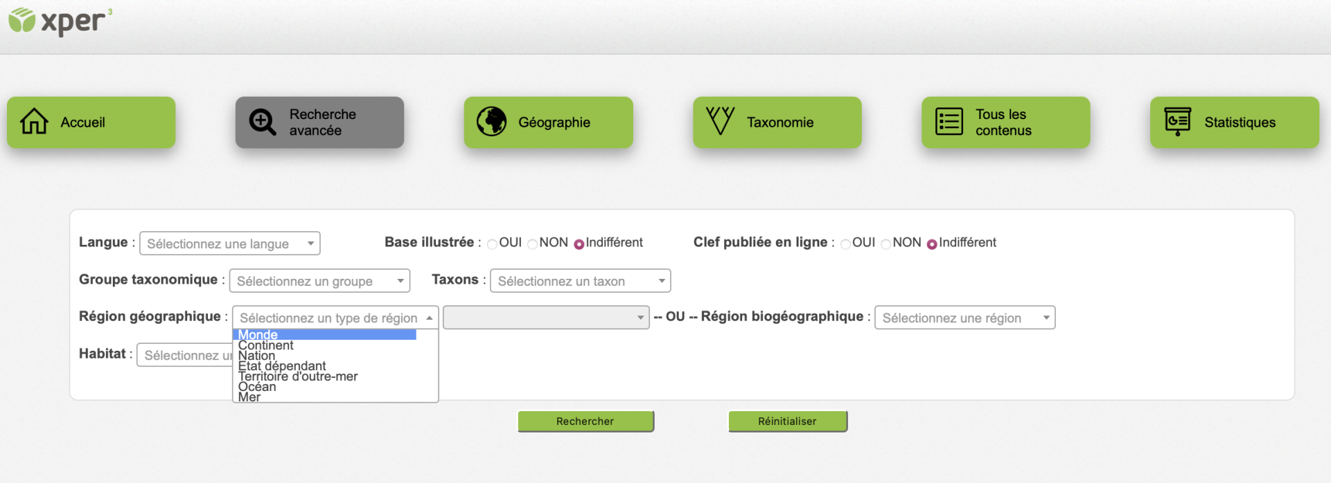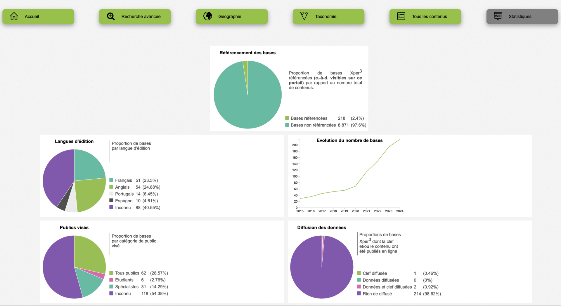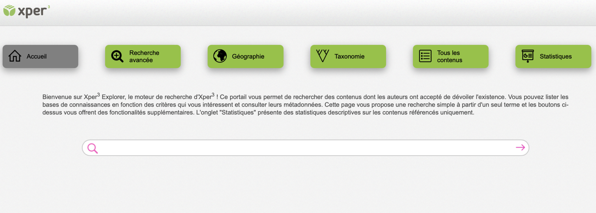 Xper3 Xplorer est le moteur de recherche d’Xper3 ! Ce portail vous permet de rechercher des contenus dont les auteurs ont accepté de dévoiler l’existence. Vous pouvez lister les bases de connaissances en fonction des critères qui vous intéressent et consulter leurs métadonnées. Cette page vous propose une recherche simple à partir d’un seul terme et les boutons ci-dessus vous offrent des fonctionnalités supplémentaires. L’onglet « Statistiques » présente des statistiques descriptives sur les contenus référencés uniquement.